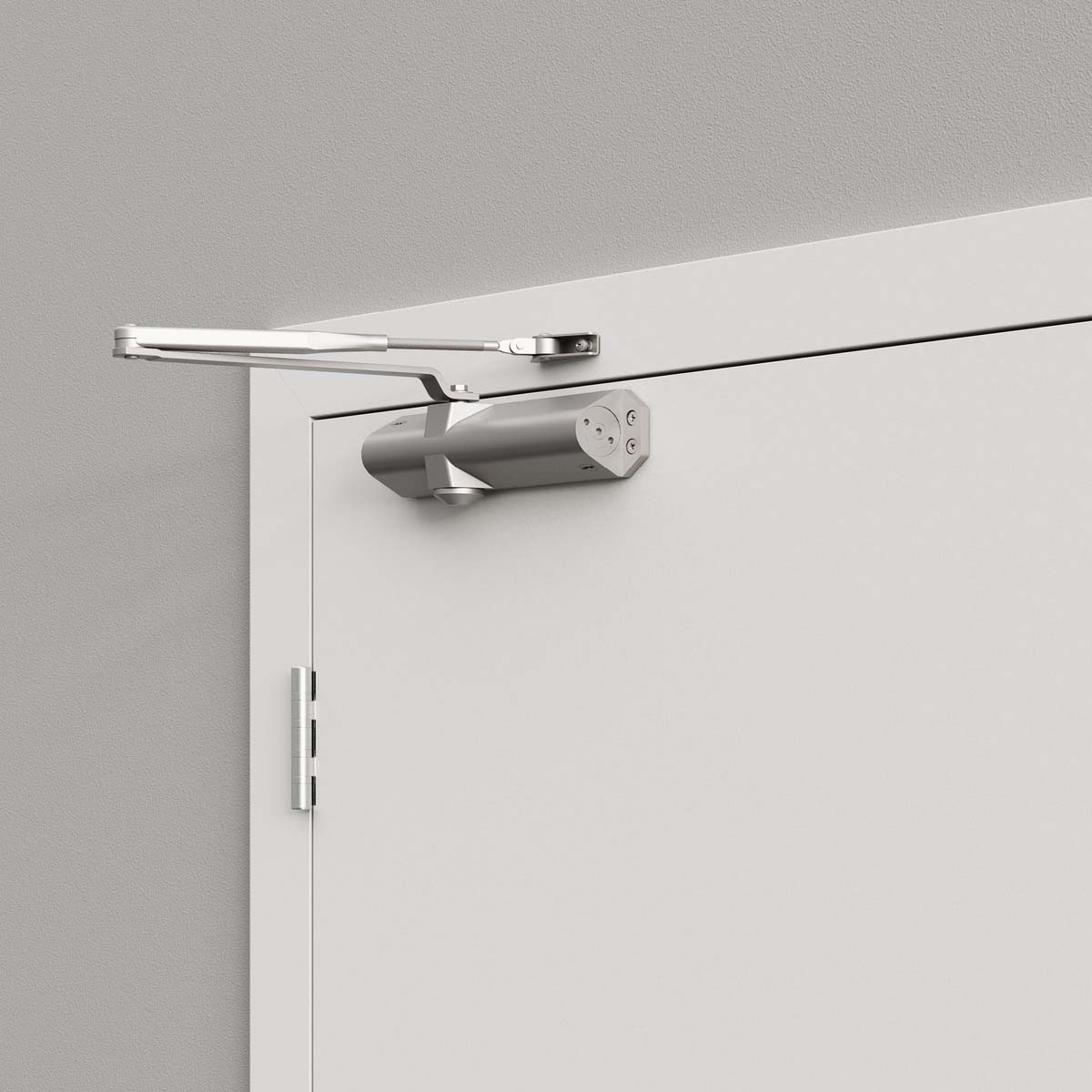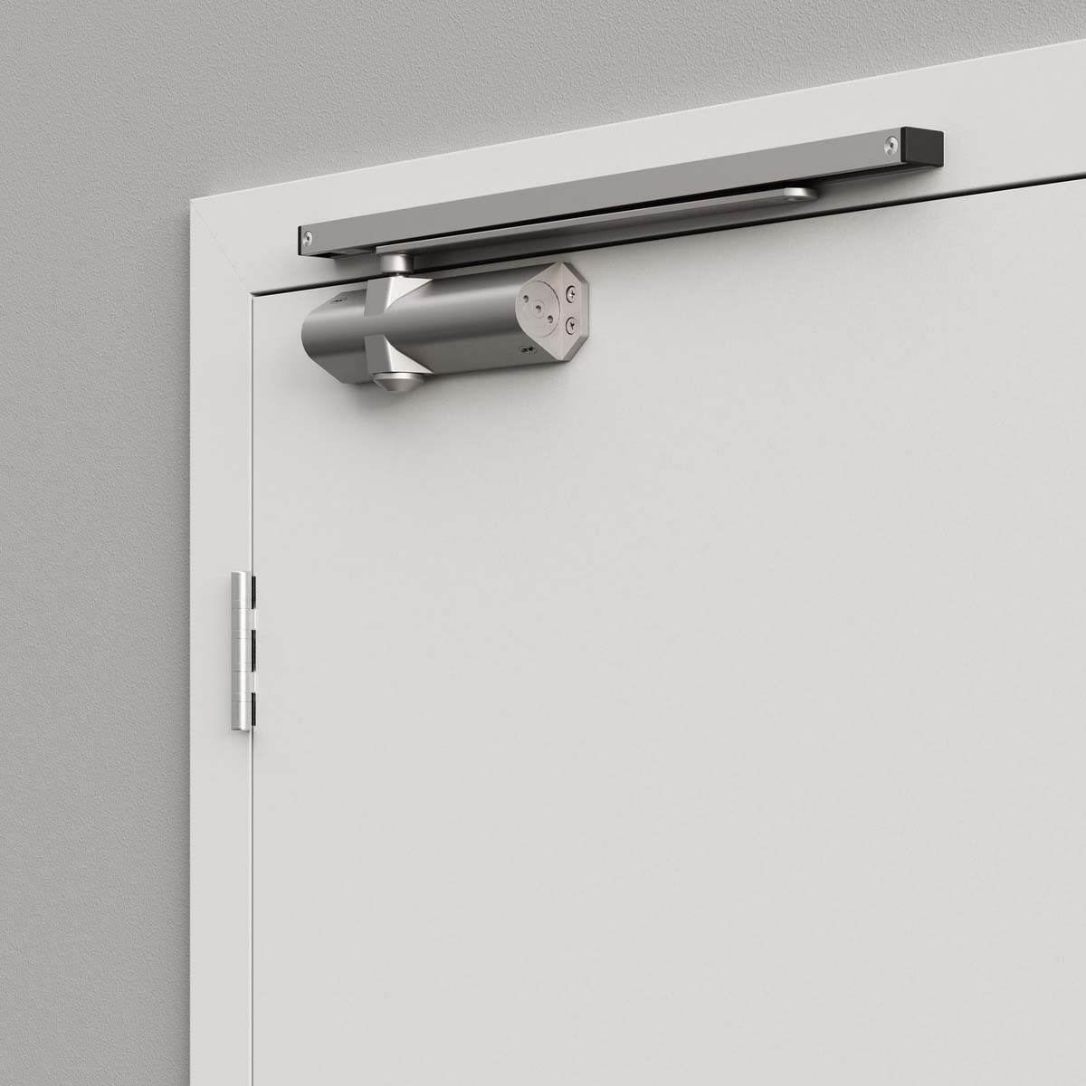 Fabricado en aluminio con acabado Gris RAL 9006, este modelo admite puertas de hasta 1250 mm de ancho y 120 kg de peso, con apertura máxima de 180°. Su construcción robusta lo hace ideal para aplicaciones comerciales, institucionales y puertas cortafuego.