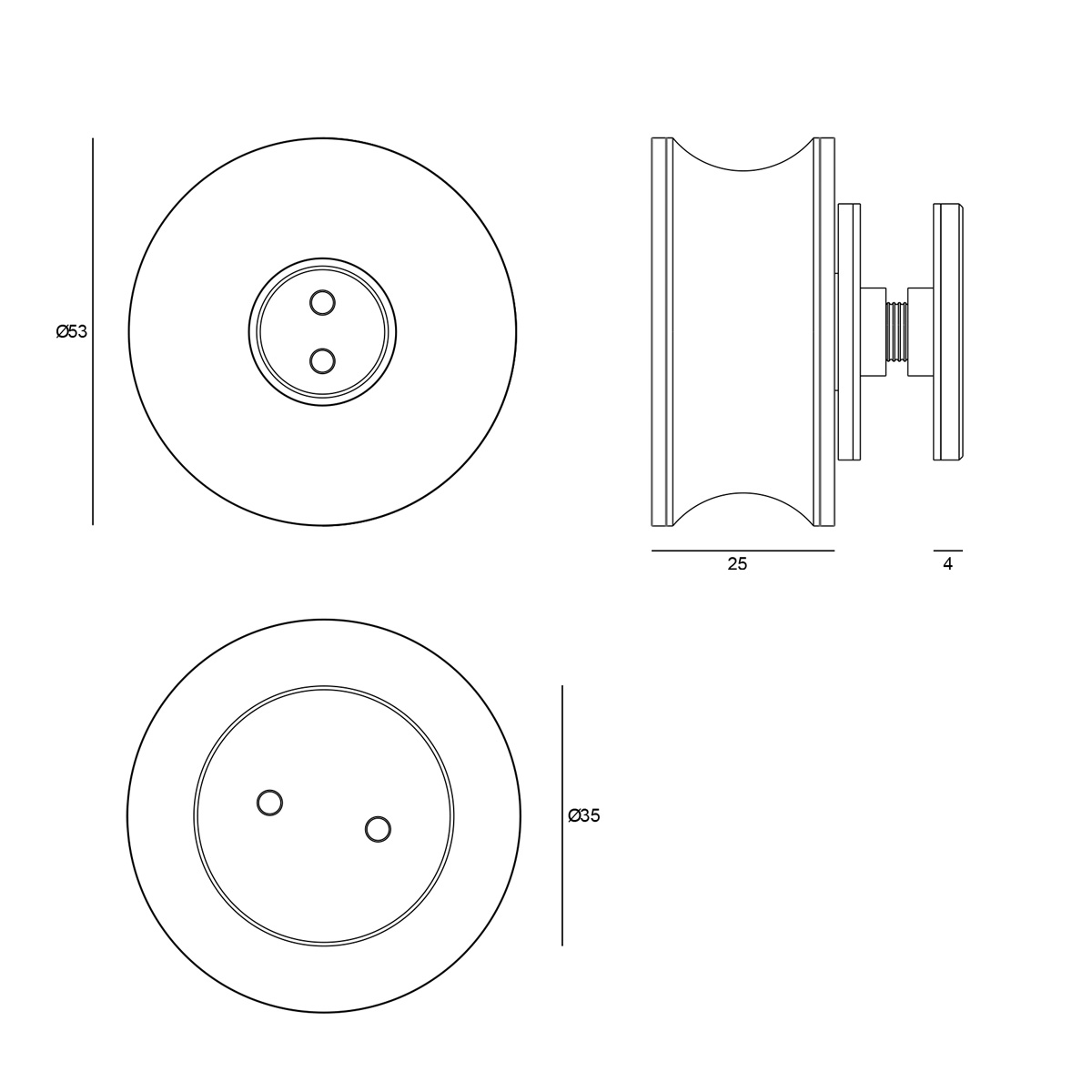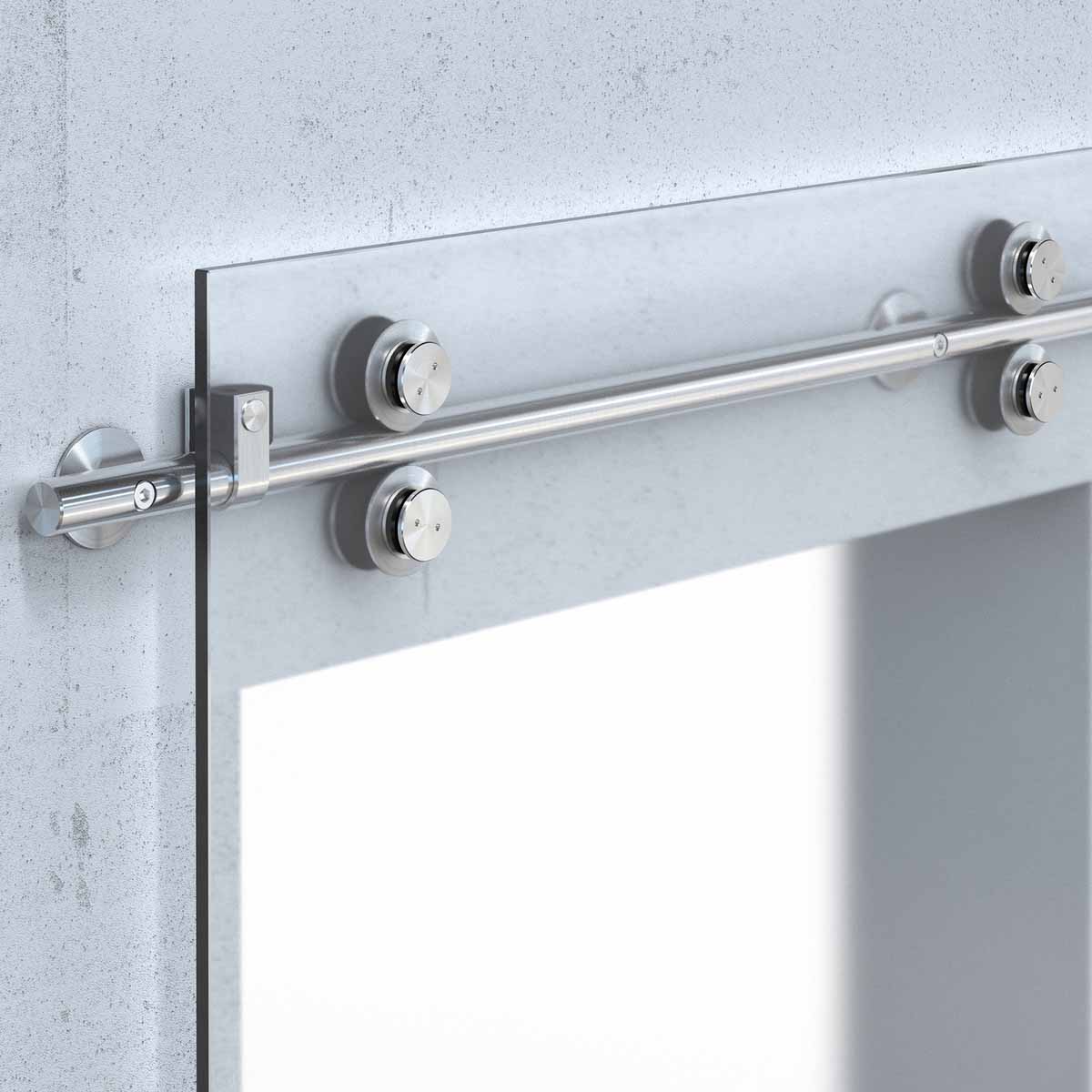 Fabricado en acero inoxidable EN 1.4301 (AISI 304) con acabado satinado, soporta hojas de vidrio de 8 a 12 mm de espesor y hasta 120 kg de peso. El sistema se instala mediante un tubo de Ø25 mm, ofreciendo máxima estabilidad y resistencia en ambientes húmedos.